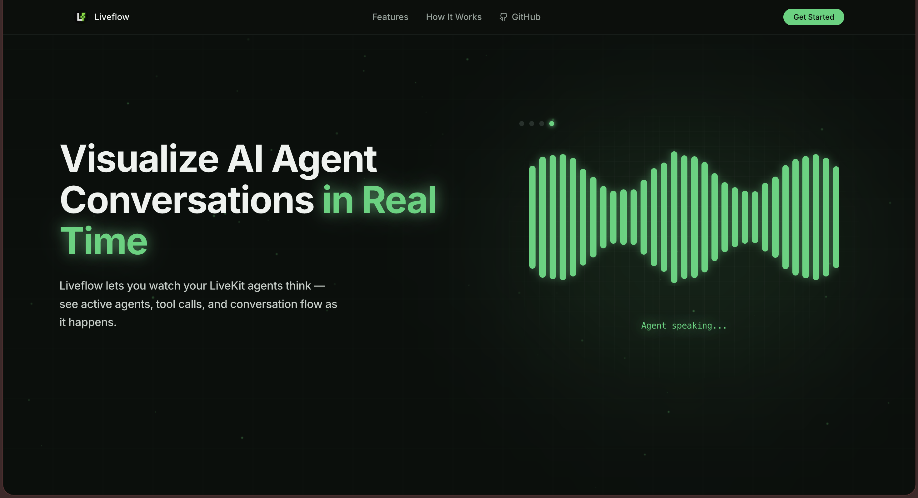Liveflow is a real-time LiveKit agent visualizer built as a two-part system: a pip-installable Python package and a VS Code extension. The Python shim wraps the LiveKit Agents SDK by monkey-patching AgentSession so it can capture agent state changes, tool executions, handoffs, transcripts, metrics, and errors, then stream those events over a local WebSocket. That means you can watch a LiveKit agent run without changing your agent code.